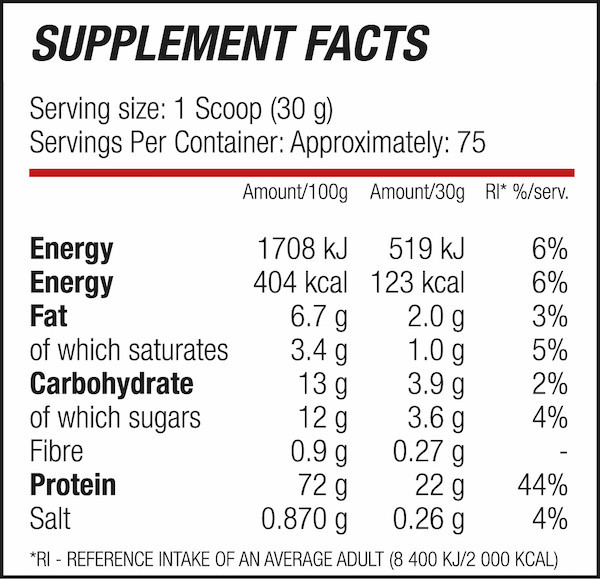 Ingredients: Protein concentrate (76%), protein isolate (12%), cocoa powder, protein powder, thickeners (sodium carbonate, methyl cellulose), flavorings, anti-caking agents, salt, sweetener (sucralose).