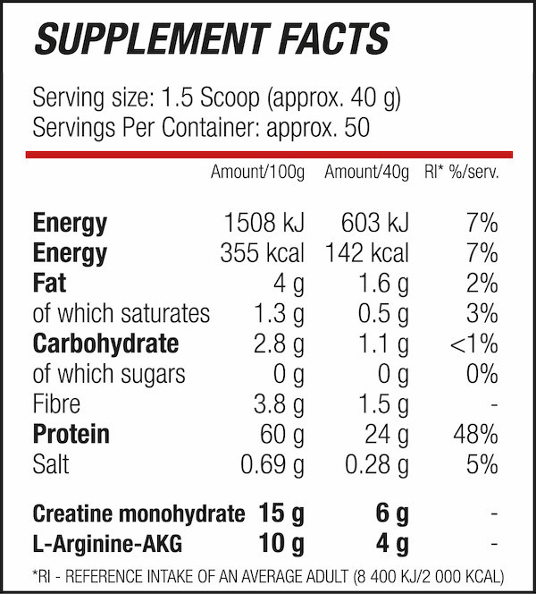 RI - reference intake for an average adult (8400 kJ / 2000 kcal). Ingredients: Hydrolyzed beef protein (60%), creatine monohydrate (15%), cocoa powder, L-arginine AKG (10%), flavorings, thickeners: sodium carbonate, methyl cellulose, anti-caking agents: calcium phosphates, salt, sweetener (sucralose). Contains no added sugar.