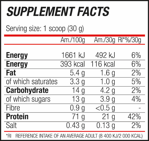 Ingredients: Protein concentrate (87%) (emulsifier: soy lecithin), protein powder, cocoa powder, fat-reduced cocoa powder, thickener (sodium carbonate, methyl cellulose), flavorings, anti-caking agent (calcium phosphate), salt, sweetener (sucralose).