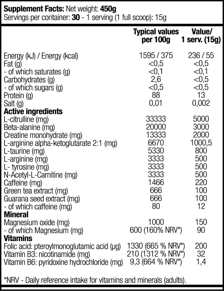 Ingredients: L-citrulline malate 2:1, Beta-alanine, Creatine monohydrate, L-arginine alpha-ketoglutarate 2:1, L-tyrosine, L-taurine, Dextrose, L-arginine, N-acetyl L-carnitine, Caffeine anhydrous, Anti-caking agent (calcium phosphate), Flavors, Mineral (magnesium oxide), Green tea leaf extract, Guarana seed extract, Sweeteners (sucralose, acesulfame-K), Vitamins (Vitamin B3: niacin, Vitamin B6: pyridoxine hydrochloride, folic acid), Color (curcumin).