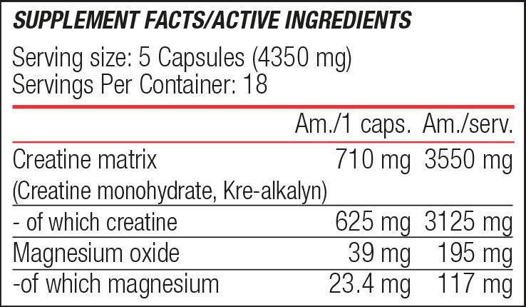 Creatine matrix (creatine monohydrate, Kre-alkalyn®), mineral (magnesium: magnesium oxid), hard gelatin capsule shell, anti-caking agent (magnesium salts of fatty acids).
