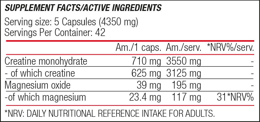 Creatine monohydrate, mineral (magnesium: magnesium oxid), hard gelatin capsule shell , anti-caking agent (magnesium salts of fatty acids).