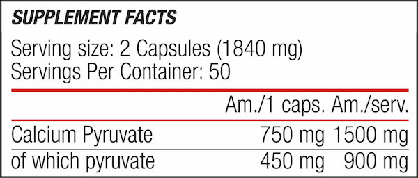 Ingredients: Calcium pyruvate, capsule shell (gelatin, purified water, calcium carbonate, starch sodium octenyl succinate), maltodextrin, anti-caking agents (magnesium salts of fatty acids, silicon dioxide).