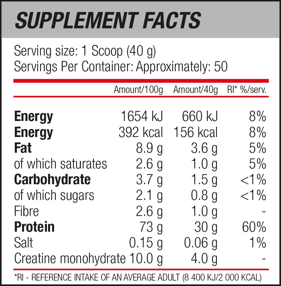 Tejsavófehérje koncentrátum-és kazein kombinációja, minimális szénhidrát és zsír kíséretében, magas, adagonkénti 30 gramm-os fehérjetartalommal és kreatinnal.
