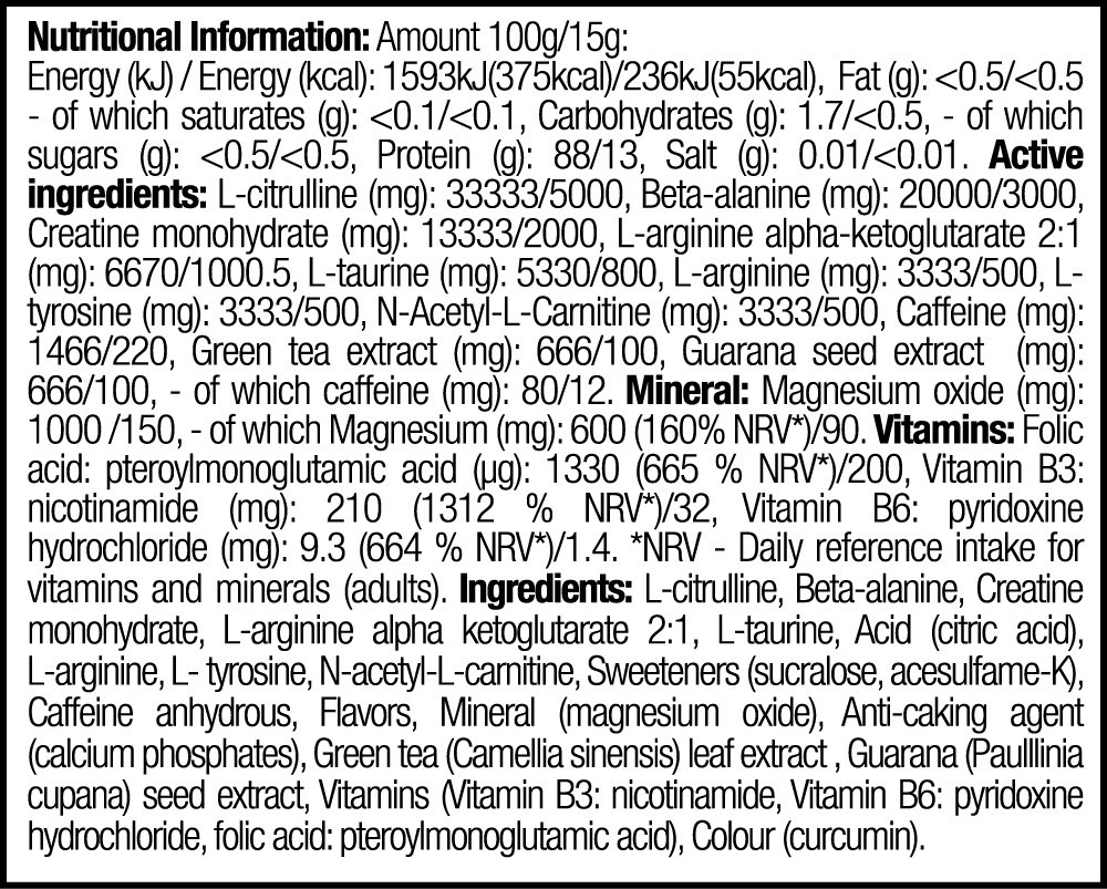 Ingredients: L-citrulline malate 2:1, Beta-alanine, Creatine monohydrate, L-arginine alpha-ketoglutarate 2:1, L-tyrosine, L-taurine, Dextrose, L-arginine, N-acetyl L-carnitine, Caffeine anhydrous, Anti-caking agent (calcium phosphate), Flavors, Mineral (magnesium oxide), Green tea leaf extract, Guarana seed extract, Sweeteners (sucralose, acesulfame-K), Vitamins (Vitamin B3: niacin, Vitamin B6: pyridoxine hydrochloride, folic acid), Color (curcumin).