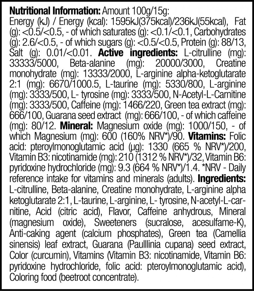 Ingredients: L-citrulline malate 2:1, Beta-alanine, Creatine monohydrate, L-arginine alpha-ketoglutarate 2:1, L-tyrosine, L-taurine, Dextrose, L-arginine, N-acetyl L-carnitine, Caffeine anhydrous, Anti-caking agent (calcium phosphate), Flavors, Mineral (magnesium oxide), Green tea leaf extract, Guarana seed extract, Sweeteners (sucralose, acesulfame-K), Vitamins (Vitamin B3: niacin, Vitamin B6: pyridoxine hydrochloride, folic acid), Color (curcumin).