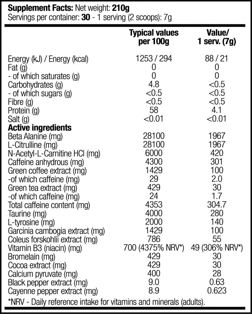 Ingredients: Beta-alanine, L-citrulline malate 2:1, N-acetyl-L-carnitine HCl, (pineapple flavor), Caffeine anhydrous, Taurine acid, L-tyrosine, Garcinia cambogia extract, Coleus forskhlii extract, Green coffee extract, Sweeteners, Vitamin B3 Niacin, Green tea, Bromelain, Cocoa extract, Calcium pyruvate, Bioprine (black pepper extract), Cayenne pepper extract