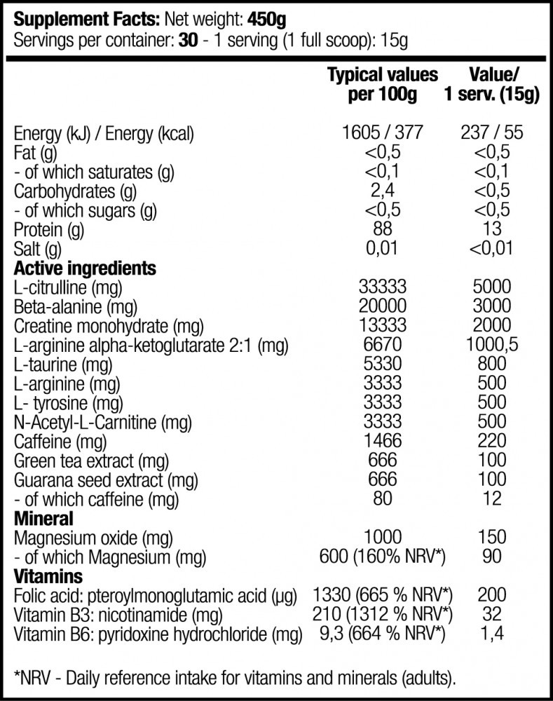 Ingredients: L-citrulline malate 2:1, Beta-alanine, Creatine monohydrate, L-arginine alpha-ketoglutarate 2:1, L-tyrosine, L-taurine, Dextrose, L-arginine, N-acetyl L-carnitine, Caffeine anhydrous, Anti-caking agent (calcium phosphate), Flavors, Mineral (magnesium oxide), Green tea leaf extract, Guarana seed extract, Sweeteners (sucralose, acesulfame-K), Vitamins (Vitamin B3: niacin, Vitamin B6: pyridoxine hydrochloride, folic acid), Color (curcumin).