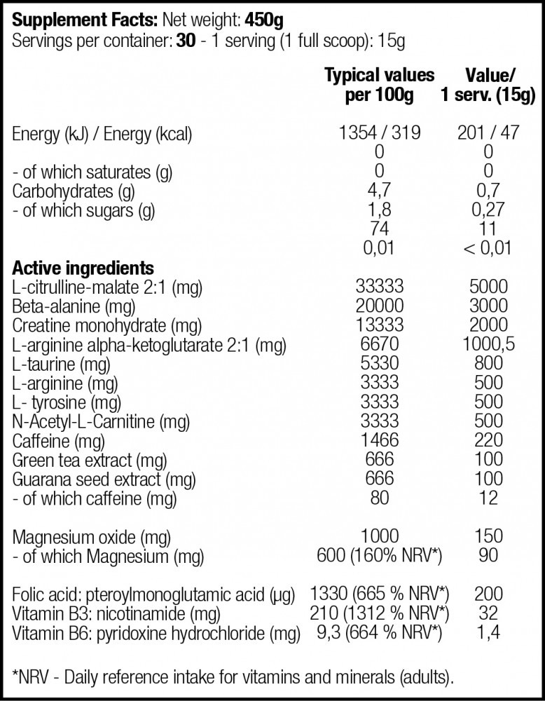 Ingredients: L-citrulline malate 2:1, Beta-alanine, Creatine monohydrate, L-arginine alpha-ketoglutarate 2:1, L-tyrosine, L-taurine, Dextrose, L-arginine, N-acetyl L-carnitine, Caffeine anhydrous, Anti-caking agent (calcium phosphate), Flavors, Mineral (magnesium oxide), Green tea leaf extract, Guarana seed extract, Sweeteners (sucralose, acesulfame-K), Vitamins (Vitamin B3: niacin, Vitamin B6: pyridoxine hydrochloride, folic acid), Color (curcumin).