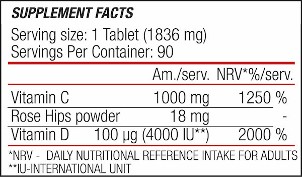 Vitamin C (L-ascorbic acid), bulking agent (microcrystalline cellulose), anti-caking agents (talc, magnesium salts of fatty acids), Vitamin D (cholecalciferol), coating [(thickeners (hydroxypropyl methylcellulose, polydextrose), anti-caking agent (talc), maltodextrin, fully hydrogenated coconut oil and palm kernel oil)], rosehip powder (1%).