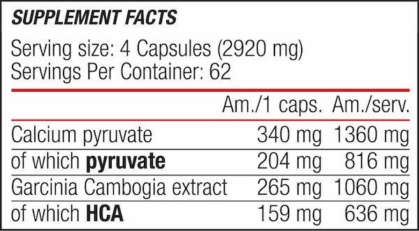 Calcium pyruvate, Garcinia cambogia fruit extract, hard gelatin capsule shell (gelatin, purified water, calcium carbonate, starch sodium octenyl succinate), anti-caking agent (magnesium salts of fatty acids).