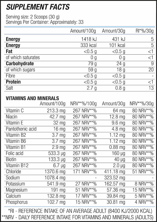Isotonic drink powder, which helps in overcoming muscle cramps, as well as replenishes a significant portion of the fluids and electrolytes lost during intensive workouts.