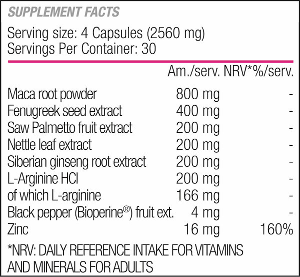 Fenugreek seed extract is included to enhance libido and muscle mass, as it has the ability to reduce fatigue and depression while stimulating sexual desire. Because it positively affects protein synthesis, it is recommended for use after waking up in the morning. The formula also contains Saw palmetto fruit extract, which is commonly used to mitigate benign prostatic hyperplasia and prostatitis. It acts as a diuretic, facilitating urination and water elimination. Scientific research has shown that 320 mg of saw palmetto per day can reduce urinary symptoms by 28% and nocturia by 25%, while increasing urine volume and reducing residual bladder urine by 43%. This 100% plant-based extract in VIRODEX XT® helps improve quality of life and may delay the progression of prostate issues.