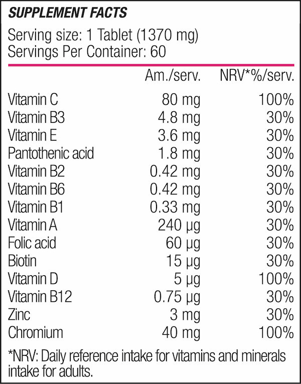 Ingredients: maltodextrin, sweeteners (sorbitol, sucralose), vitamins (vitamin C: L-ascorbic acid, niacin: nicotinamide, vitamin E: DL-alpha-tocopheryl acetate, pantothenic acid: calcium-D-pantothenate, vitamin B6: pyridoxine hydrochloride, riboflavin: riboflavin, thiamin: thiamin mononitrate, vitamin A: retinyl acetate, folic acid: pteroylmonoglutamic acid, biotin: D-biotin, vitamin D: cholecalciferol, vitamin B12: cyanocobalamin), flavoring, bulking agent (microcrystalline cellulose), color (carotenes), anti-caking agents (talc, magnesium salts of fatty acids), minerals (zinc: zinc oxide, chromium: chromium picolinate).