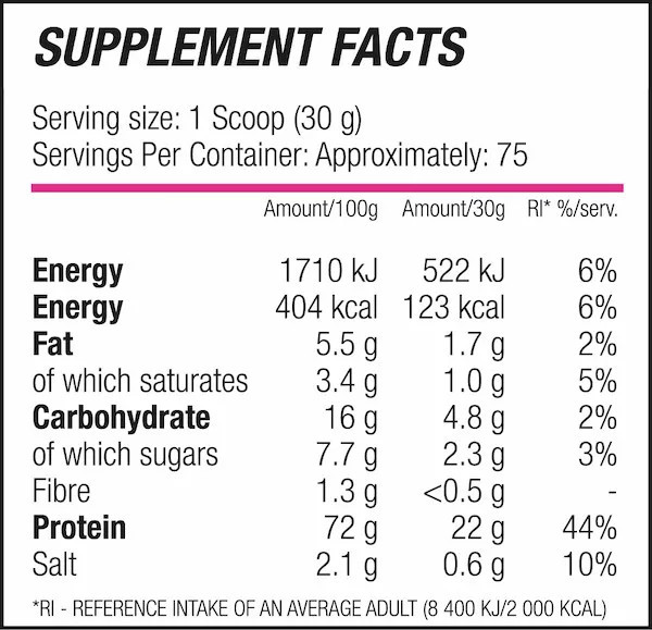 Ingredients: Protein concentrate (76%), protein isolate (12%), cocoa powder, protein powder, thickeners (sodium carbonate, methyl cellulose), flavorings, anti-caking agents, salt, sweetener (sucralose).