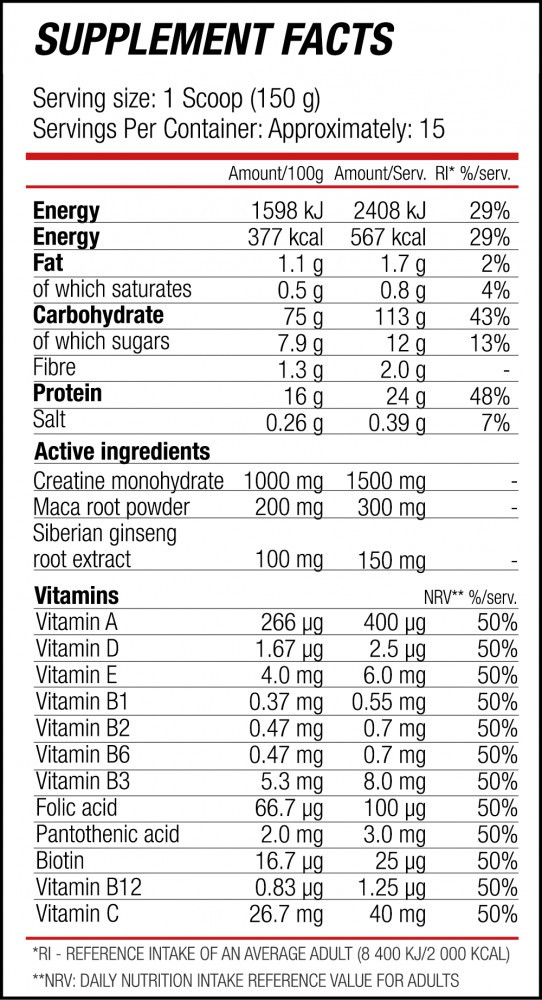 Ingredients: Carbohydrate complex [maltodextrin, fructose, isomaltulose (palatinose)], rice protein, glutamine peptide (contains gluten), 3% amino acid complex [creatine monohydrate, L-lysine HCl, BCAAs (L-leucine, L-isoleucine, L-valine)], flavorings, chocolate pieces [sugar, cocoa mass, cocoa butter, low-fat cocoa powder, coating agent (talc), emulsifier (lecithins), flavoring], thickening agent (cellulose gum), anti-caking agent (calcium phosphates), salt, maca (Lepidium Meyenii Walp) root powder, Siberian ginseng (Eleutherococcus senticosus) root extract, color (curcumin), vitamins (Vitamin C: L-ascorbic acid, Niacin: nicotinamide, Vitamin E: DL-alpha-tocopheryl acetate, Pantothenic acid: calcium D-pantothenate, Vitamin B6: pyridoxine hydrochloride, Vitamin B2: riboflavin, Thiamin: thiamin mononitrate, Vitamin A: retinyl acetate, Folic acid: pteroylmonoglutamic acid, Biotin: D-biotin, Vitamin D: cholecalciferol, Vitamin B12: cyanocobalamin), sweetener (sucralose).*