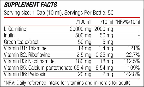 High dose L-carnitine content. Lactose-, gluten-, and sugar-free. Carbohydrate-free. Practical, ready-to-drink formula. Economical packaging. Consume 10 ml before training.