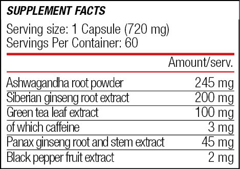 Ashwagandha (Withania somnifera) root powder, Siberian ginseng (Eleutherococcus senticosus) root extract (10:1), capsule shell (gelatin, purified water, calcium carbonate, starch sodium octenyl succinate), green tea (Camellia sinensis) leaf extract (containing 0% EGCG) (50:1), ginseng (Panax ginseng C.A. Meyer) root and stem extract (10:1), anti-caking agent (magnesium salts of fatty acids), black pepper (Piper Nigrum) fruit extract (40:1).