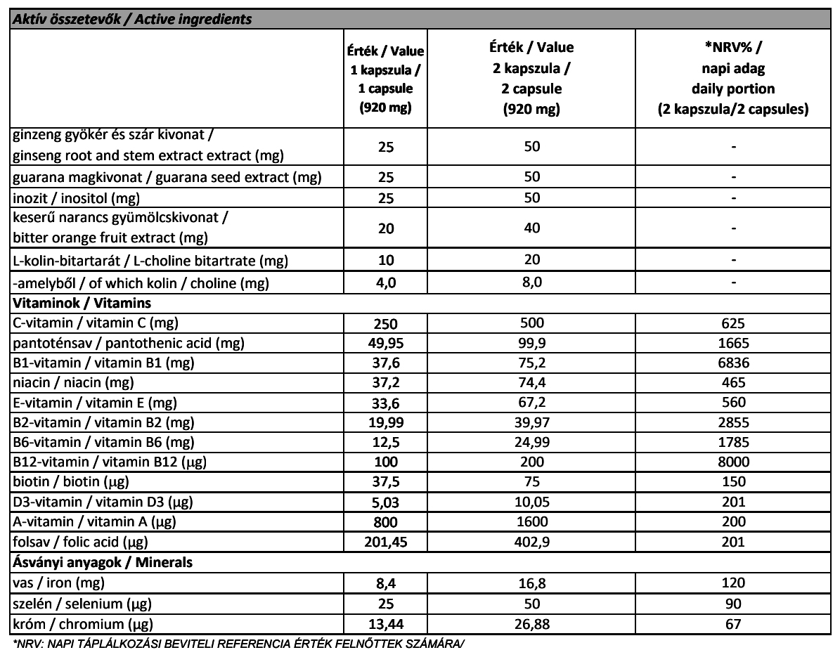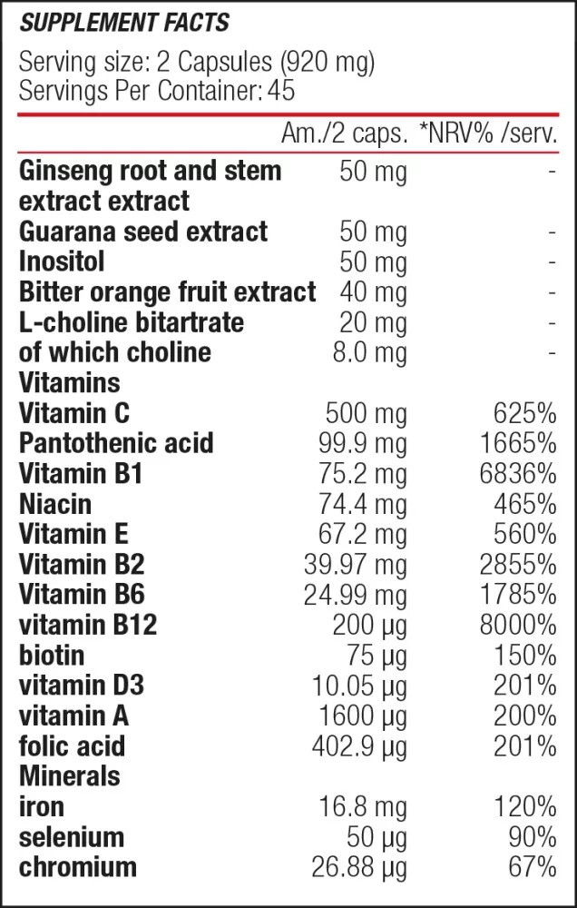 Vitamins (Vitamin C: L-ascorbic acid, Vitamin B12: cyanocobalamin, Vitamin E: DL-alpha-tocopheryl acetate, Pantothenic acid: calcium D-pantothenate, Vitamin B1: thiamine hydrochloride, Niacin: nicotinamide, Vitamin B2: riboflavin, Vitamin B6: pyridoxine hydrochloride, Vitamin A: retinyl acetate, Biotin: D-biotin, Vitamin D: cholecalciferol, Folic acid: pteroylmonoglutamic acid), capsule shell (gelatin, purified water, calcium carbonate, starch sodium octenyl succinate), corn starch, minerals (Iron: ferrous bisglycinate, Selenium: L-selenomethionine, Chromium: chromium picolinate), ginseng (Panax ginseng C.A. Meyer) root and stem extract (10:1), guarana (Sapindaceae Paullinia cupana Kunth) seed extract (1:1), inositol (myo-inositol), bitter orange (Citrus aurantium L.) fruit extract (10:1), choline (L-choline bitartrate), anti-caking agent (magnesium salts of fatty acids).