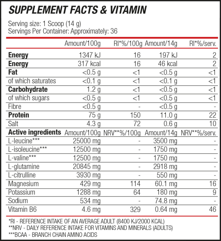 BLADE BCAA Direct is a specialized amino acid matrix featuring branched-chain amino acids in a 2:1:1 ratio of L-Leucine, L-Isoleucine, and L-Valine, further enhanced with Glutamine, Citrulline malate, and Vitamin B6. This formula simultaneously maximizes training intensity and accelerates recovery. Its scientifically engineered complex of active ingredients boosts ATP production, speeds up cell regeneration, and increases cell volume.