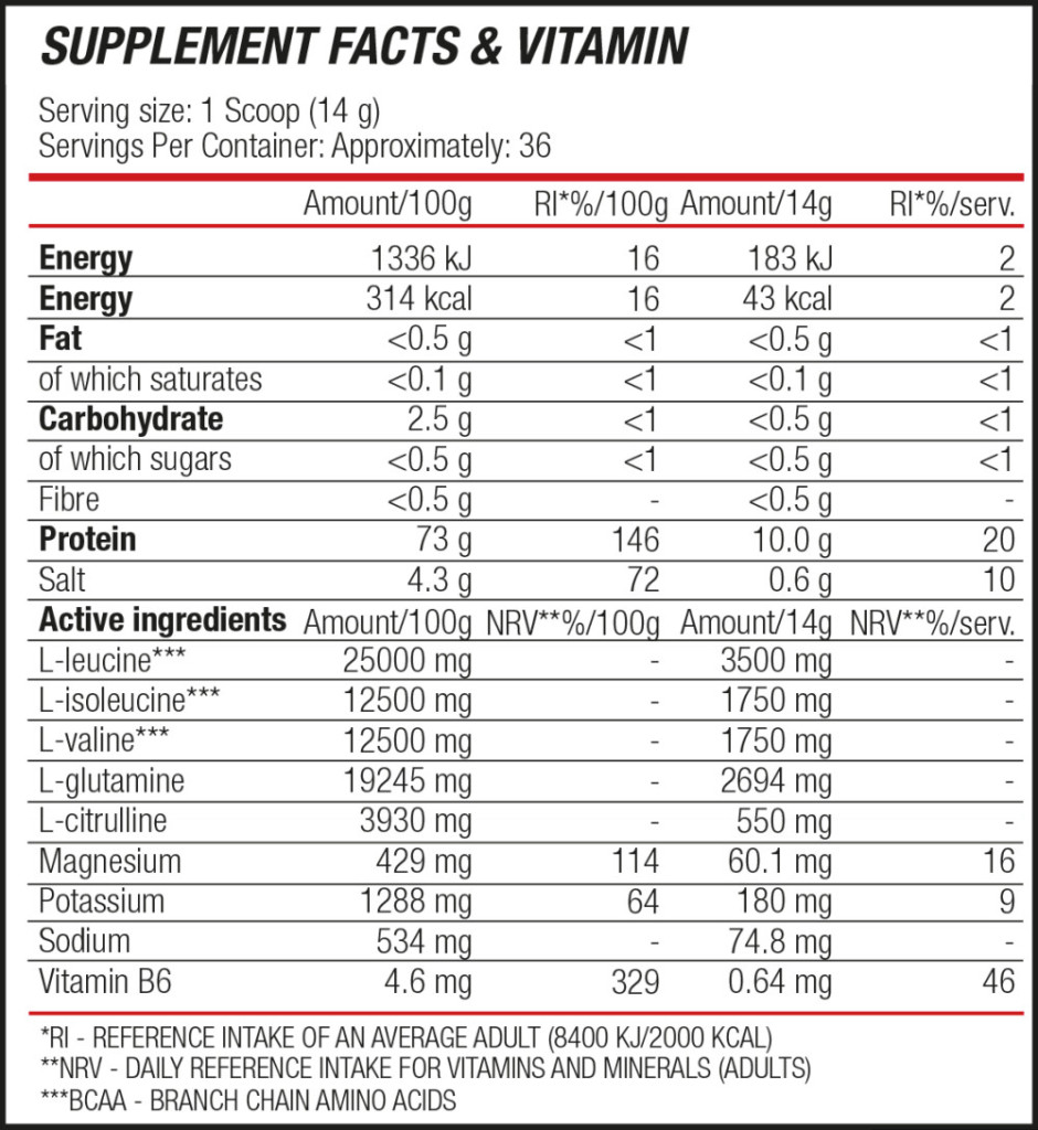 BLADE BCAA Direct is a specialized amino acid matrix featuring branched-chain amino acids in a 2:1:1 ratio of L-Leucine, L-Isoleucine, and L-Valine, further enhanced with Glutamine, Citrulline malate, and Vitamin B6. This formula simultaneously maximizes training intensity and accelerates recovery. Its scientifically engineered complex of active ingredients boosts ATP production, speeds up cell regeneration, and increases cell volume.