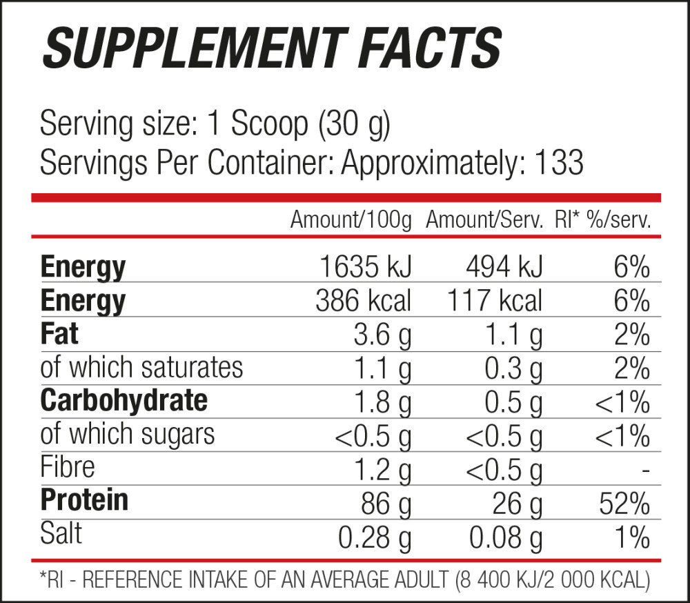 79% Protein matrix [soy protein isolate, lactose-reduced whey protein concentrate (emulsifier: soy lecithin), calcium caseinate (from milk)], glycine, fat-reduced cocoa powder, thickener (cellulose gum), flavorings, anti-caking agent (calcium phosphates), sweeteners (sucralose, acesulfame-K), salt.