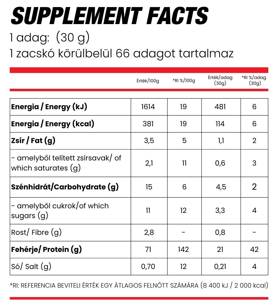 Whey protein concentrate (milk) (emulsifier: sunflower lecithin), L-glycine (20%), L-glutamine (15%), skimmed milk powder, cocoa powder, L-lysine (5%), maltodextrin, flavorings, thickener (cellulose gum), salt, anti-caking agent (silicon dioxide), sweetener (sucralose).