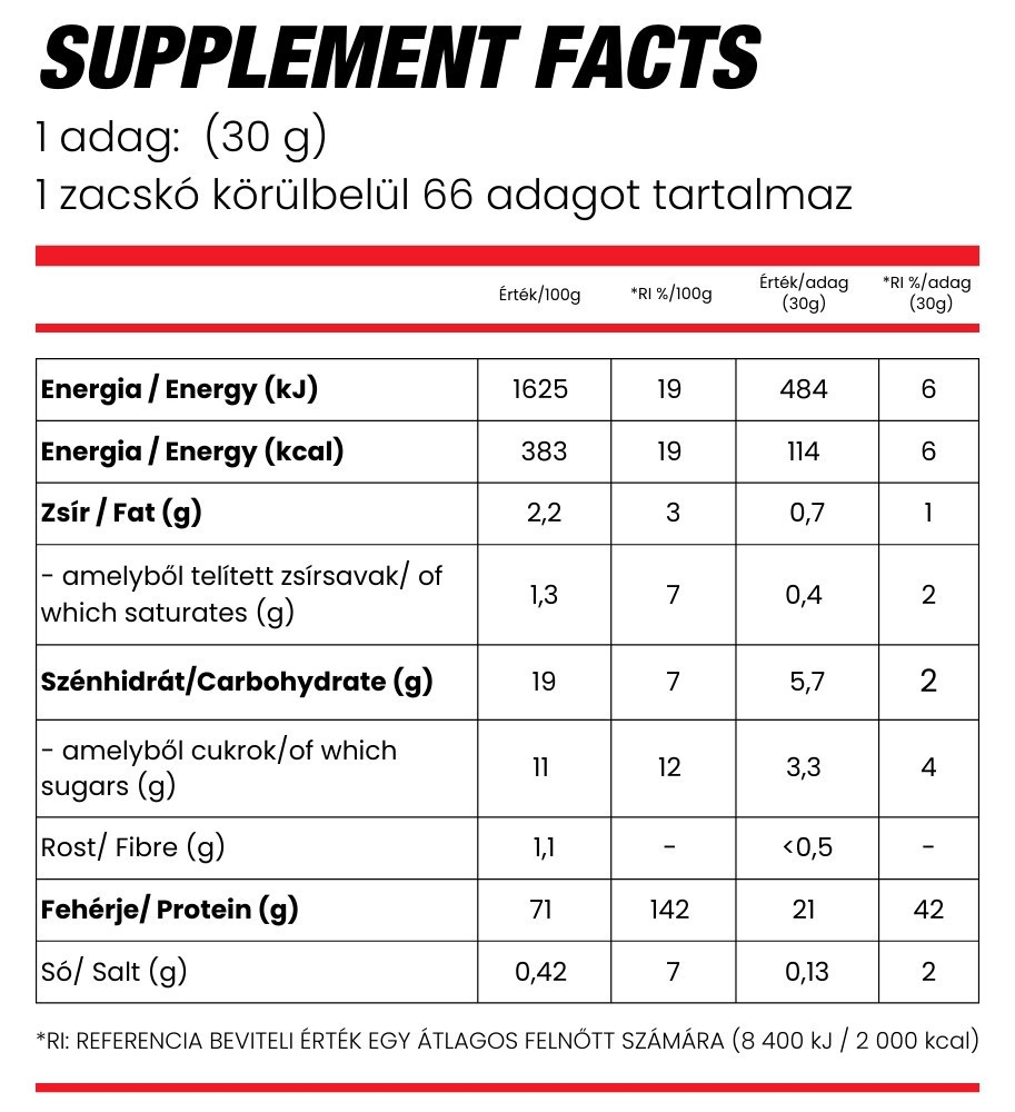 Whey protein concentrate (milk) (emulsifier: sunflower lecithin), L-glycine (20%), skimmed milk powder, L-glutamine (15%), maltodextrin, L-lysine (5%), thickener (cellulose gum), flavorings, coloring food (beetroot concentrate), acid (citric acid), anti-caking agent (silicon dioxide), sweetener (sucralose), salt, color (curcumin).