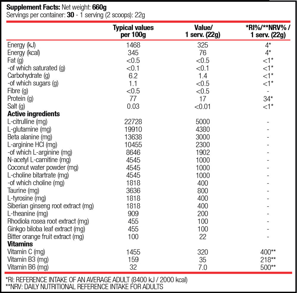 L-citrulline, L-glutamine, beta-alanine, L-arginine HCl, flavorings, N-acetyl L-carnitine, coconut water powder (coconut water powder (Cocos nucifera L.) fruit, maltodextrin), choline (L-choline bitartrate), taurine, food acid (citric acid), L-tyrosine, Siberian ginseng (Eleutherococcus senticosus) root extract (10:1), vitamins [Vitamin C: L-ascorbic acid, Vitamin B3: nicotinamide, Vitamin B6: pyridoxine hydrochloride], anti-caking agent (calcium phosphates), sweeteners (acesulfame-K, sucralose), L-theanine, coloring food (beetroot concentrate), Rhodiola Rosea root extract (2:1), ginkgo biloba (Ginkgo biloba L.) leaf extract (50:1), bitter orange (Citrus aurantium L.) fruit extract (10:1), color (copper complexes of chlorophylls and chlorophyllins).